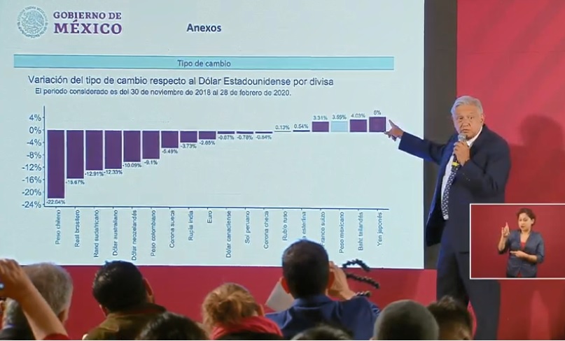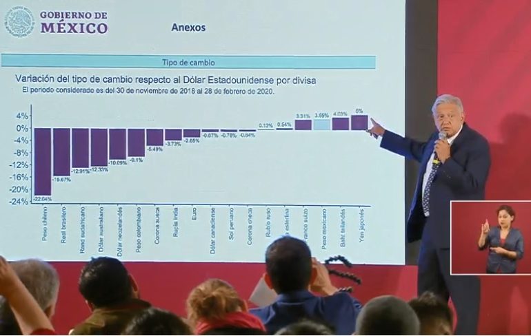 El presidente mostró en una gráfica que, desde que asumió el poder en diciembre de 2018, el peso se ha apreciado un 3.55% respecto al dólar a diferencia de países con gobiernos conservadores como Chile, donde la moneda se ha depreciado cerca de un 22.04% y Brasil, un 15.67%.