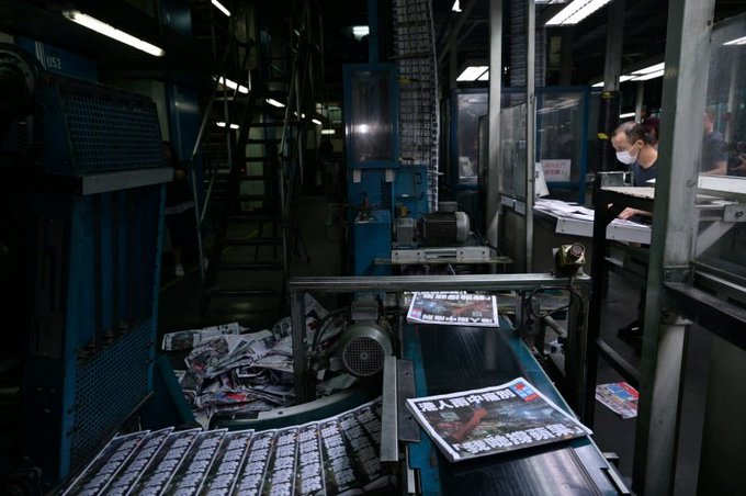 Y dentro de la redacción del Apple Daily, sus periodistas han aplaudido al editor jefe que ha enviado a la imprenta las últimas páginas del diario que ha plantado cara al régimen chino todo lo que ha podido.pic.twitter.com/png4djMEol