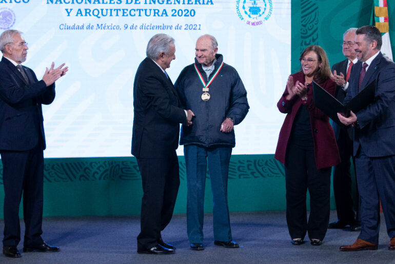 El presidente Andrés Manuel López Obrador (AMLO) entregó esta mañana los Premios Nacionales de Ingeniería y de Arquitectura 2020 al ingeniero Francisco José Garaicochea y Petrirena, por su labor en el ámbito de la industria petrolera nacional y al arquitecto Fray Gabriel Chávez de la Mora, quien participó en la obra de la Basícilica de Guadalupe.