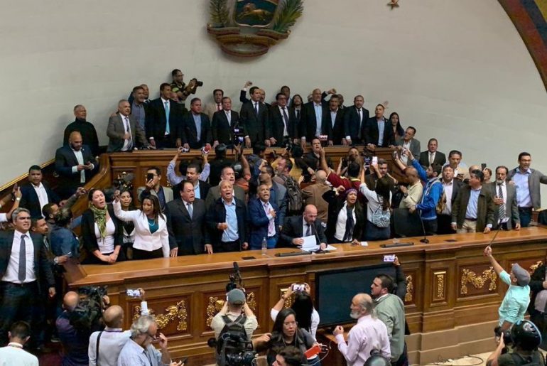 “¡Lo juro!”, gritó Guaidó desde el podio presidencial de la unicameral Asamblea Nacional, único poder en manos de la oposición en Venezuela.