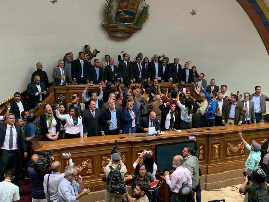 El diputado rival Luis Parra, autoproclamado el domingo presidente de la cámara con el apoyo del chavismo, presidió justo antes otra sesión. A la llegada de Guaidó, abandonó del hemiciclo.