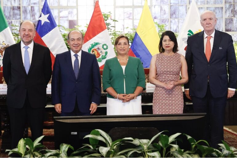 Boluarte presidió una ceremonia de conmemoración de los 12 años de la Alianza del Pacífico, a la que asistieron el expresidente de México Felipe Calderón y el excanciller chileno Alfredo Moreno, además de emitirse un saludo en video del exmandatario colombiano Juan Manuel Santos.