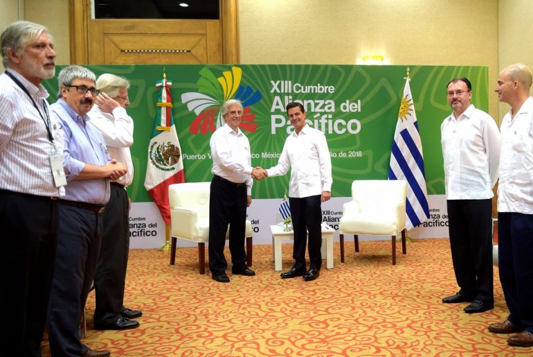 El presidente Enrique Peña Nieto, en su papel de presidente Pro-Témpore de la Alianza del Pacífico, encabeza en Puerto Vallarta, Jalisco, una reunión con sus homólogos de Chile, Colombia y Perú y los integrantes del Mercosur, Michel Temer de Brasil; Tabaré Vázquez de Uruguay, además de representantes de Argentina y Paraguay.