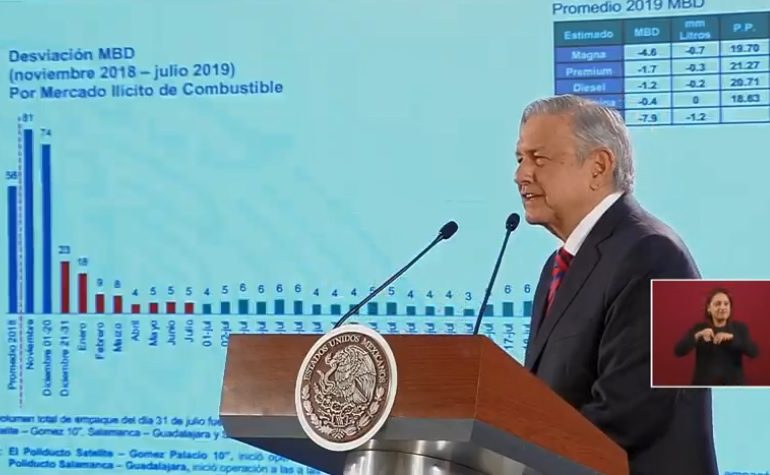 Recordó que anteriormente se robaban 800 pipas diarias, y de acuerdo a datos presentados este jueves, ahora se se están robando solo 40. Añadió que eran 80 mil barriles diarios los que se robaban, y ahora se roban 4 mil barriles diarios.