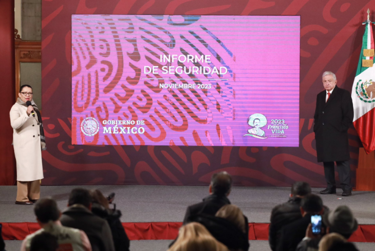 Durante la #ConferenciaPresidente, la secretaria de seguridad @rosaicela_ presenta el informe de seguridad mensual.