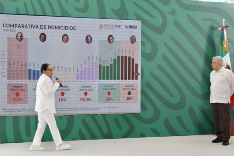 “El homicidio doloso disminuyó 21.8% (desde el máximo histórico de julio de 2018). Se trata del mes de octubre más bajo de los últimos siete años, es decir, que estamos hablando de cifras parecidas a mediados del año de 2016”, afirmó Rosa Icela Rodríguez.