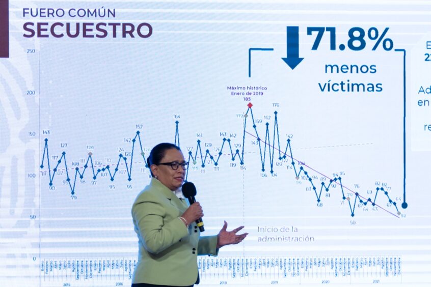 Asimismo, aseveró que el delito de secuestro disminuyó 22.3% respecto a 2020 y 50% en comparación con 2019. Además, tuvo una baja del 71.8 % en diciembre de 2021 respecto a enero de 2019, cuando se registró un máximo histórico de 185 víctimas.