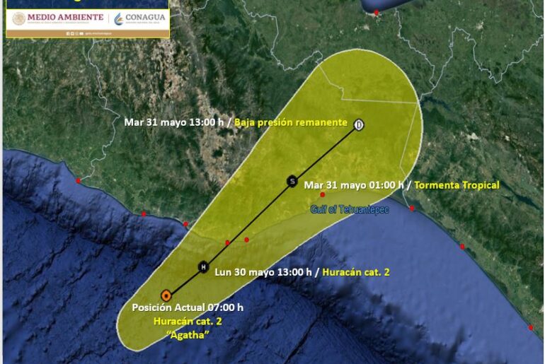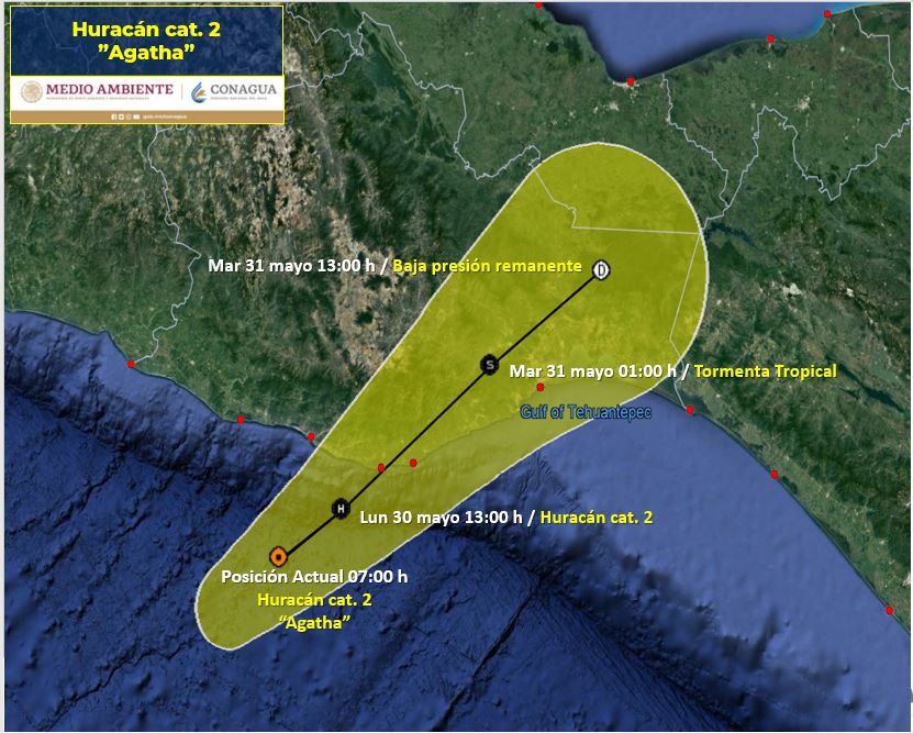 El huracán Agatha, de categoría 2, se dirige este lunes hacia la costa pacífica del sur del país, amenazando con descargar lluvias torrenciales sobre diversos puntos de Oaxaca, cuando se adentre en tierra al final del día.