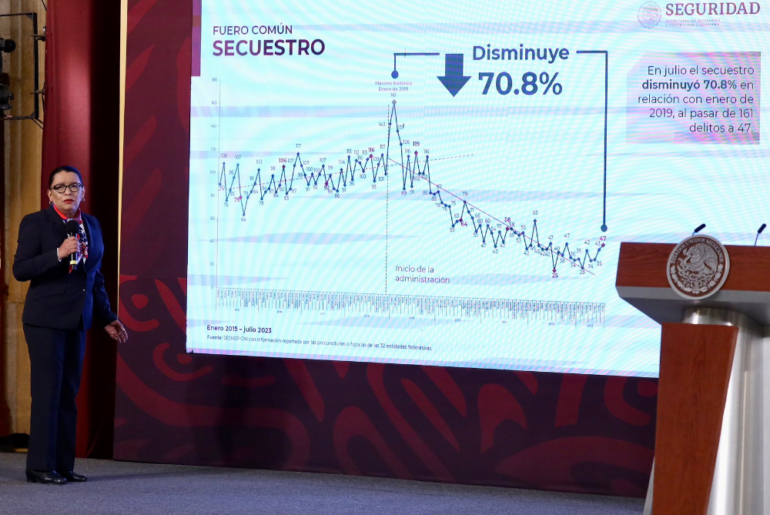 Además, dijo que el promedio diario de víctimas de homicidio doloso bajó un 6% en julio, con 83, frente a los 88 por día de 2022, y se redujo un 18% comparado con 2018, cuando se contabilizaron 101 homicidios diarios.