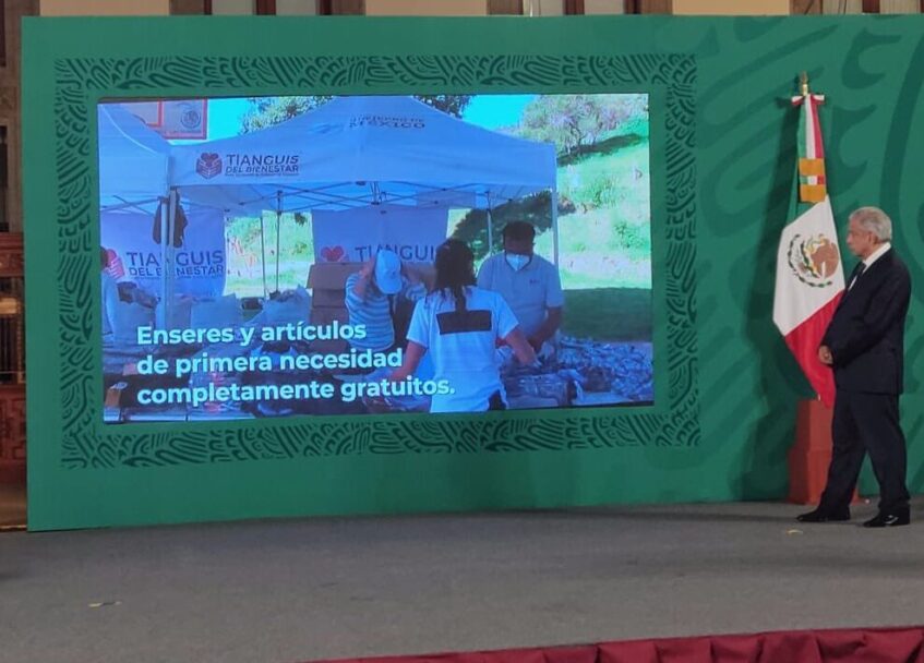 El presidente Andrés Manuel López Obrador presentó esta mañana el programa ‘Tianguis del Bienestar’, que consiste en llevar a las comunidades más pobres del país mercancía decomisada al crimen organizado, y ponerla a disposición de los habitantes de manera gratutita.