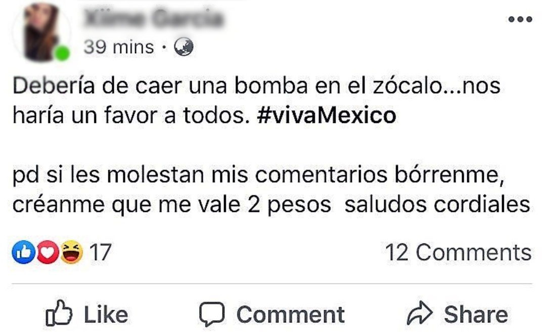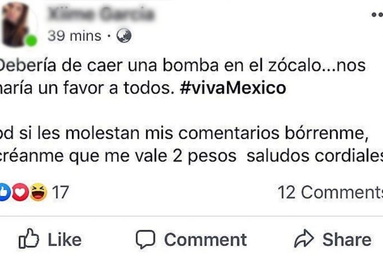 “Debería caer una bomba en el zócalo…nos haría un favor a todos. #vivaMéxico”, escribió la mujer en sus redes.
