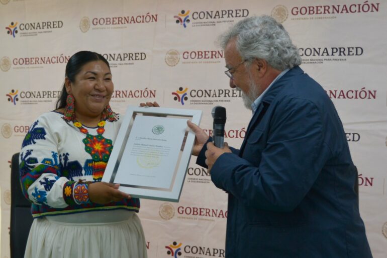 El subsecretario de Derechos Humanos, Población y Migración de la Secretaría de Gobernación, Alejandro Encinas, tomó protesta a la nueva presidenta del Consejo Nacional para Prevenir la Discriminación (Conapred), Claudia Olivia Morales Reza, representante de la comunidad wixárika de Jalisco.