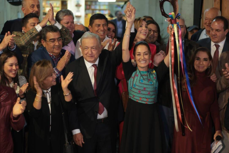 Retomando un ritual de los pueblos indígenas mexicanos, López Obrador cedió el bastón de mando a Sheinbaum.