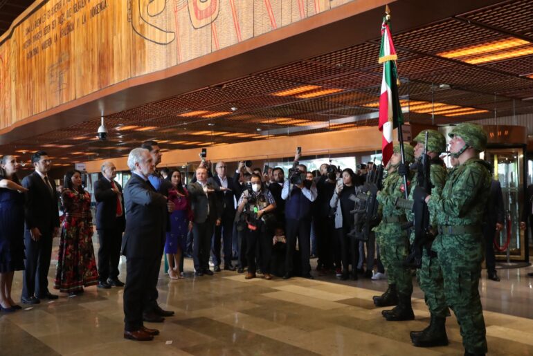 “De manera improvisada, y sin acuerdo con ninguna de las fuerzas políticas representadas en las cámaras legislativas, impuso que se hicieran los honores a la Bandera en el vestíbulo de San Lázaro, argumentando que no podía permitir el ingreso de armas al Recinto”; sin embargo, señaló que de acuerdo con el artículo 25 del Reglamento de la Cámara el “Recinto es el conjunto arquitectónico que alberga la Cámara, incluyendo Salón de Sesiones, edificios de oficinas, patios, jardines, estacionamientos y demás bienes nacionales destinados para el funcionamiento de la Cámara”.