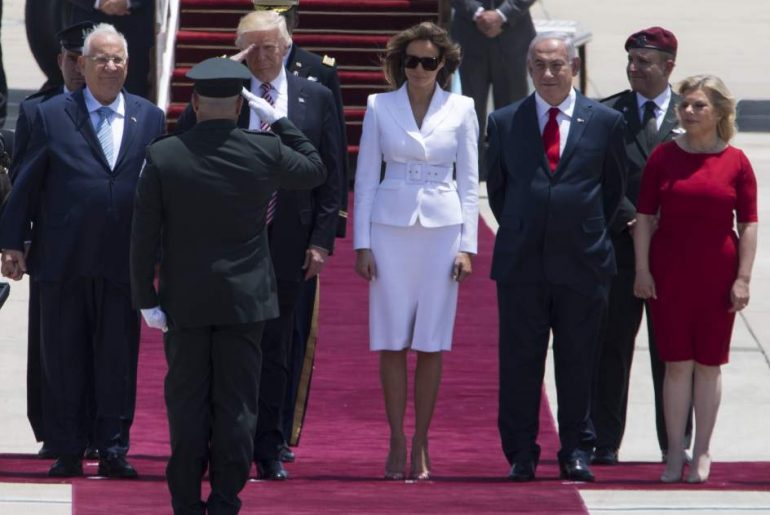 En su arribo a la Ciudad de Tel Aviv, miemntras avanzaban en la alfombra en donde fueron recibidos por Benjamin Netanyahu, primer ministro de Israel, y su esposa, Sara, Trump vuelve a dejar atrás a Melania, quien caminó detrás del grupo por algunos pasos, situación que parece provocó su enojo, ya que al extenderle la mano a Melania, esta soltó un manotazo al mandatario estadounidense.