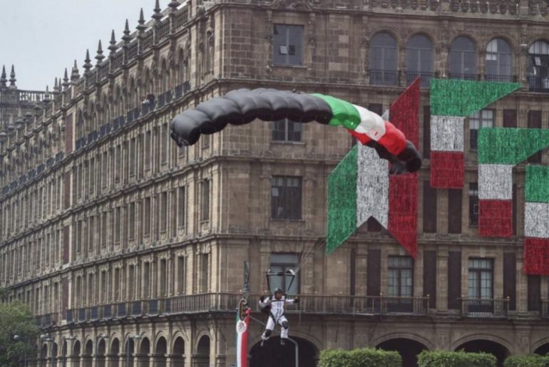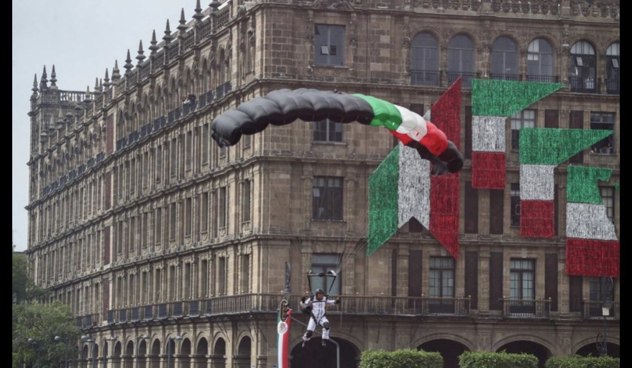 El elemento se pasó del punto de aterrizaje durante el desfile y cayó en la parte trasera de Palacio Nacional, sobre Corregidora.