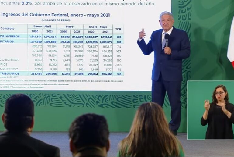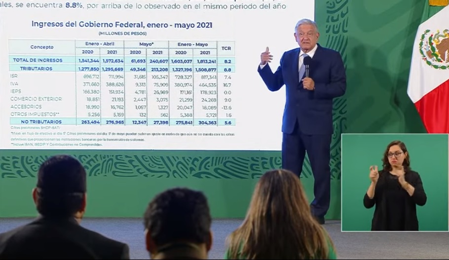 Dijo que en el periodo enero a mayo, se tiene una recaudación de un billón 813 mil 241 millones de pesos, comparado con lo registrado en el mismo periodo del año pasado que fue de un billón 603 mil. Dijo que a pesar de la pandemia y la crisis económica que generó, se recaudaron más de 200 mil millones de pesos, que en términos cuantitativos, es un incremento de 8.2%.