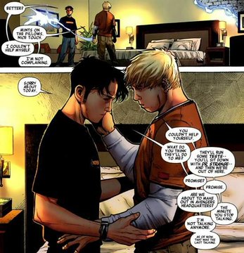 El libro, llamado Vengadores, la cruzada de los niños, presenta una escena en la que dos personajes hombres, novios en la historia, se besan.