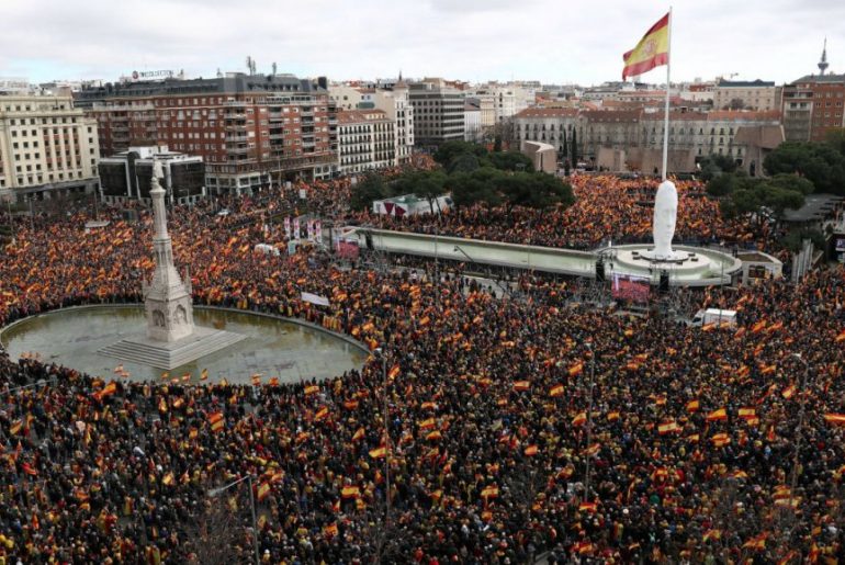 Decenas de miles de personas se reunieron este domingo en la Plaza de Colón en Madrid para protestar contra el gobierno de Pedro Sánchez por su gestión de la crisis con los independentistas de Cataluña y en demanda de la celebración de elecciones generales.