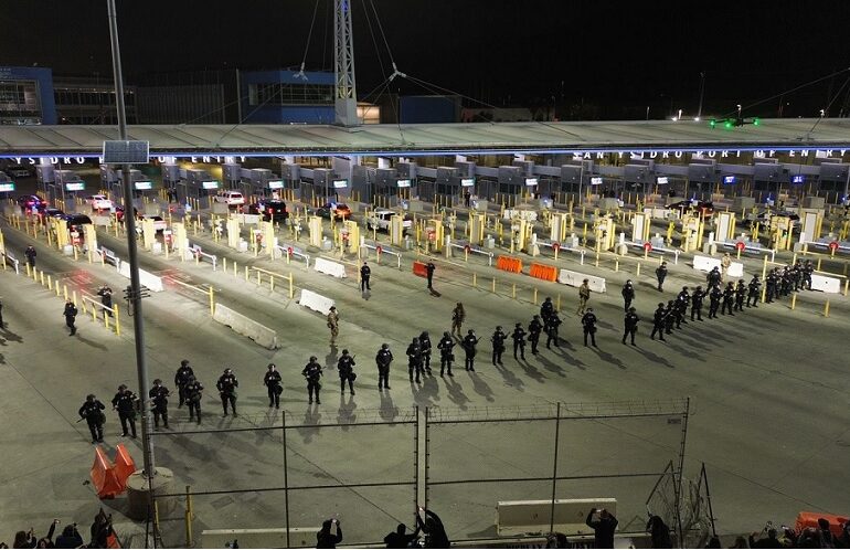 En el cruce de Tijuana a San Diego, los agentes se desplegaron en los carriles 28 al 34, en donde realizaron diversas maniobras de contención, además lanzaron varias bombas de gas y durante los aproximadamente seis minutos que duró el despliegue también se escucharon algunas detonaciones.