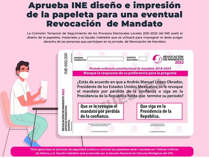 Así, la pregunta quedará como originalmente la redactó el Congreso de la Unión. Actualmente, la pregunta aprobada dice: “¿Estás de acuerdo en que (NOMBRE) Presidente (a) de los Estados Unidos Mexicanos, se le revoque el mandato por la pérdida de la confianza o siga en la presidencia de la República hasta que termine su periodo?”.