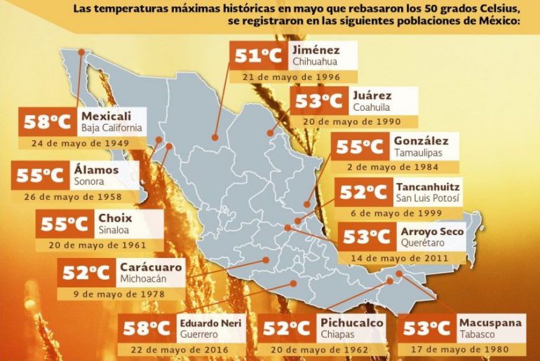 #OndaDeCalor El #SMNmx te informa en el siguiente gráfico cuáles son las #Temperaturas máximas históricas registradas durante mayo en #México pic.twitter.com/wHCpjpABaU