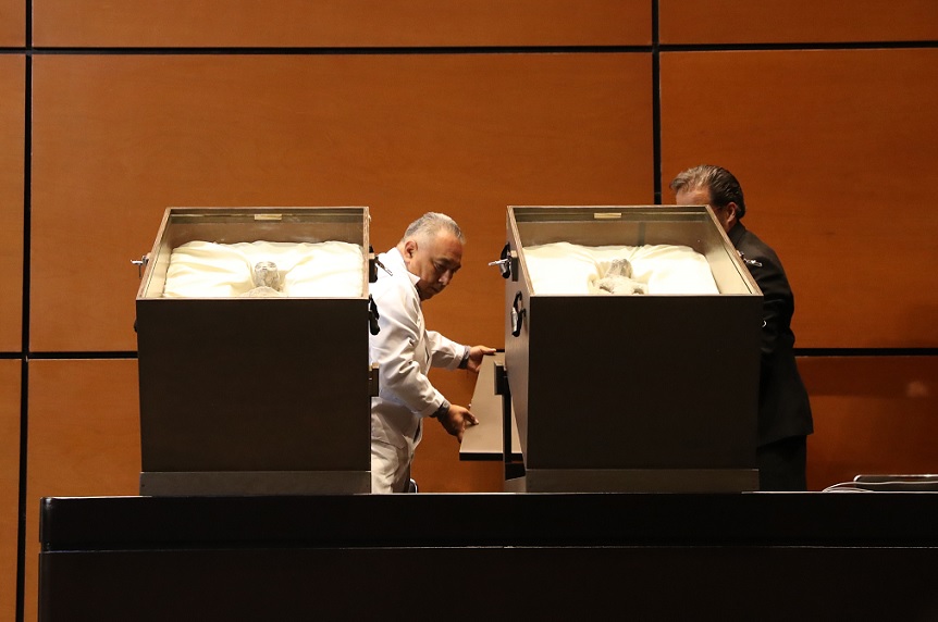 Jaime Maussan presentó dos cajas en las que, según dijo, había cuerpos “desecados” encontrados en Perú en 2017 que calificó de “seres no humanos que no son parte de nuestra evolución terrestre”. Las figuras tenían el tamaño del esqueleto de un niño.