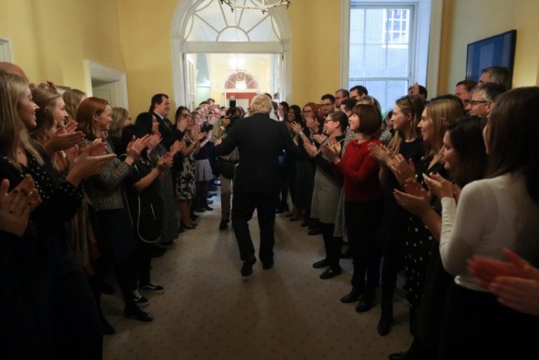 Staff welcome Prime Minister @BorisJohnson back to 10 Downing Street. pic.twitter.com/CtU4s8N3Ko