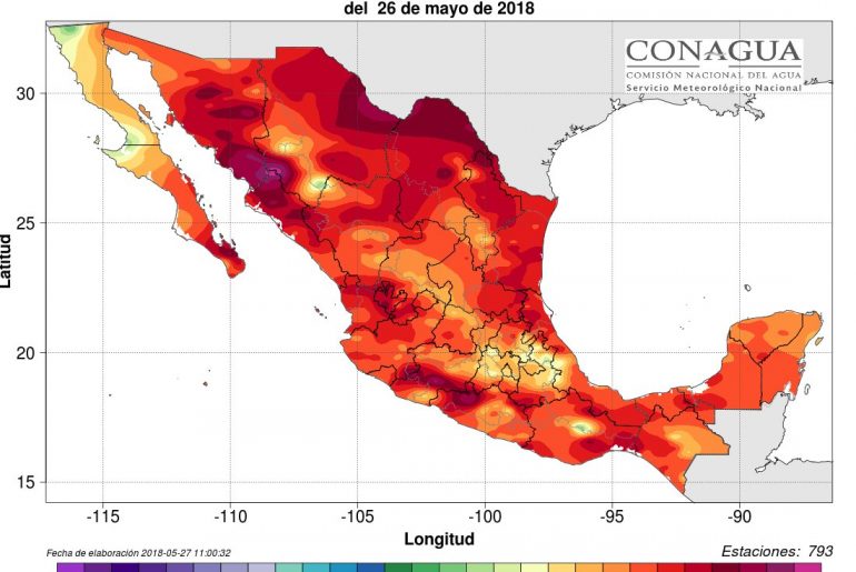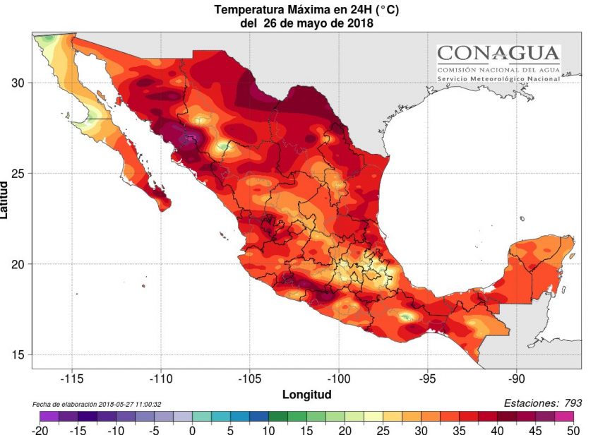 Los valores de 45 a 50 grados se estiman en zonas de Chihuahua, Sinaloa, Nayarit, Guerrero y Oaxaca; de 40 a 45 grados en puntos de Baja California Sur, Sonora, Jalisco, Michoacán, Durango, Zacatecas, Hidalgo y Morelos, y de 35 a 40 grados en regiones de Colima, Chiapas, Coahuila, Nuevo León, Aguascalientes, San Luis Potosí, Guanajuato, Querétaro, Puebla, Tamaulipas, Veracruz y Tabasco.